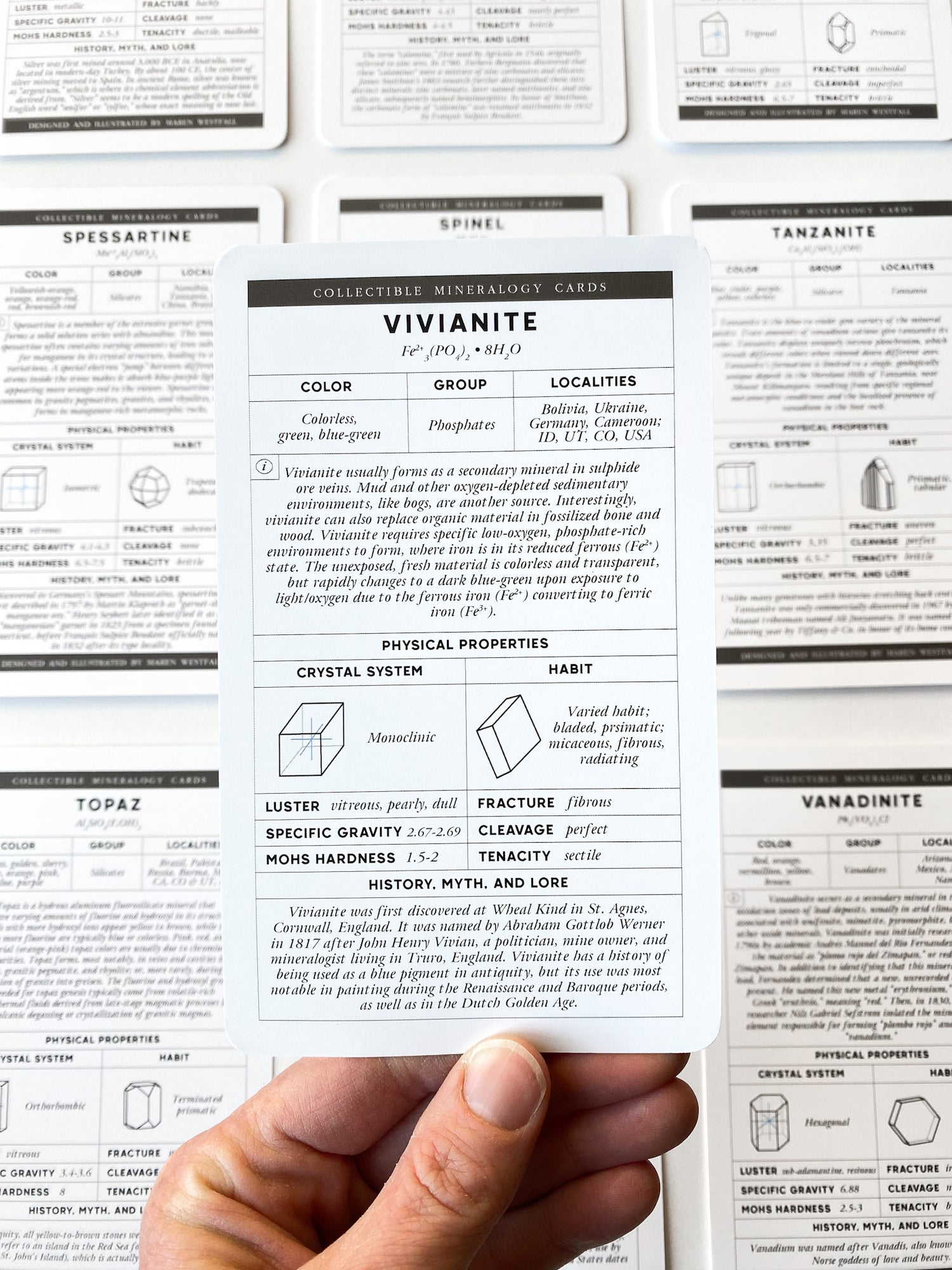 I sourced information from absolutely everywhere. Initially, I checked out every mineralogy book from my local library. That quickly revealed that there was a lack of depth and interest I was looking for. So, I turned to purchasing antique mineralogy books from Ebay. I began to form quite a rich database of modern and historical data just from all thsee books. But, we all know that the internet is probably the most up-to-date source on scientific data. So it was there that I cross referenced and double checked every detail on the cards to make sure the information I included was accurate and reliable.