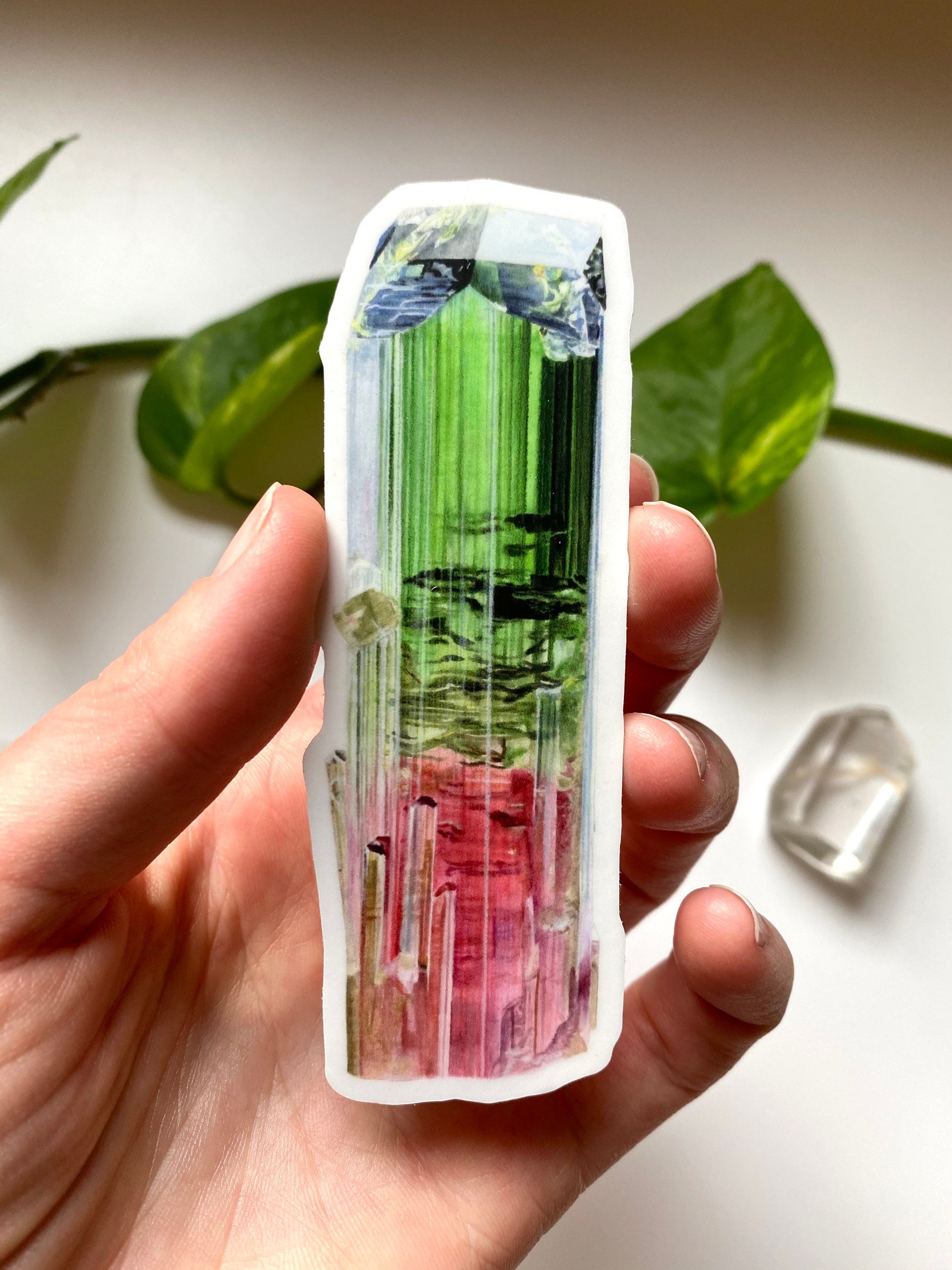 Premium custom vinyl sticker of my original watercolor painting of Bicolor Tourmaline from the Paprok region. Thick, durable vinyl protects your stickers from scratches, water & sunlight. The sticker is 4” x 1.5”, water-resistant, and printed on white with a 1/8 inch white border. They are an incredible rendition of the original artwork due to the pigment inkjet printing process.
