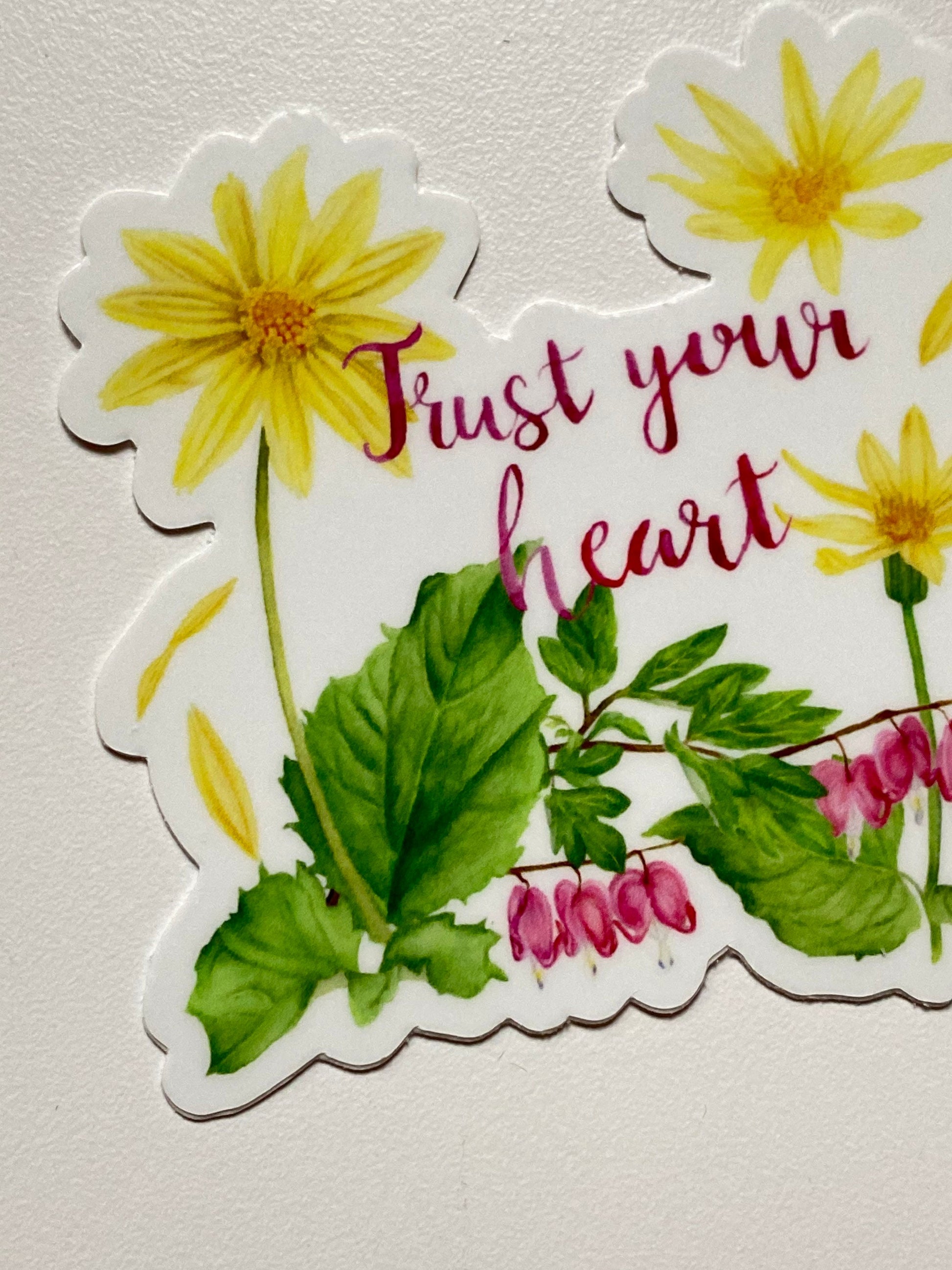 3”x3” premium waterproof botanical vinyl sticker with the message to “Trust Your Heart” nestled within Heartleaf Arnica and Bleeding Hearts flowers.