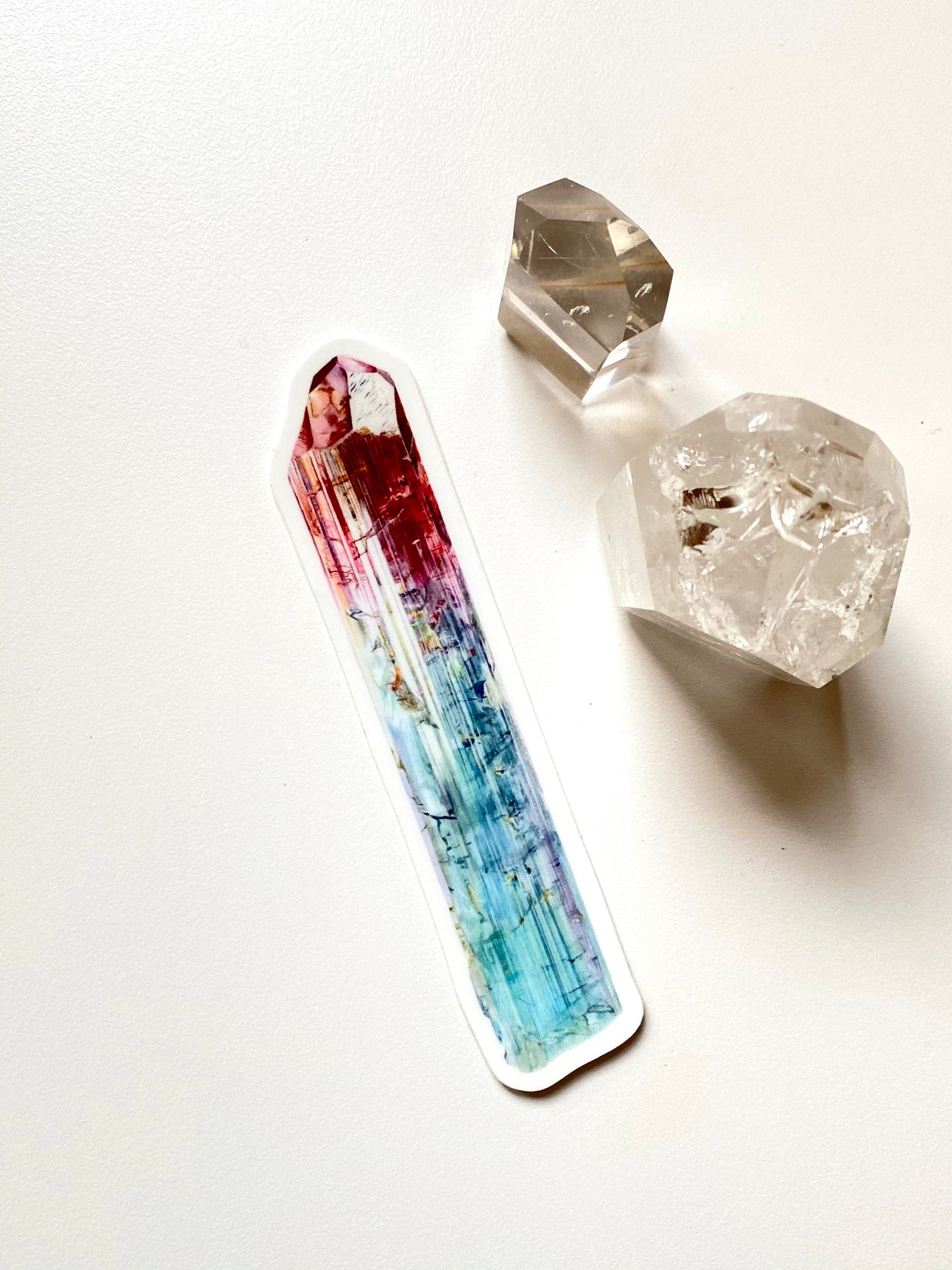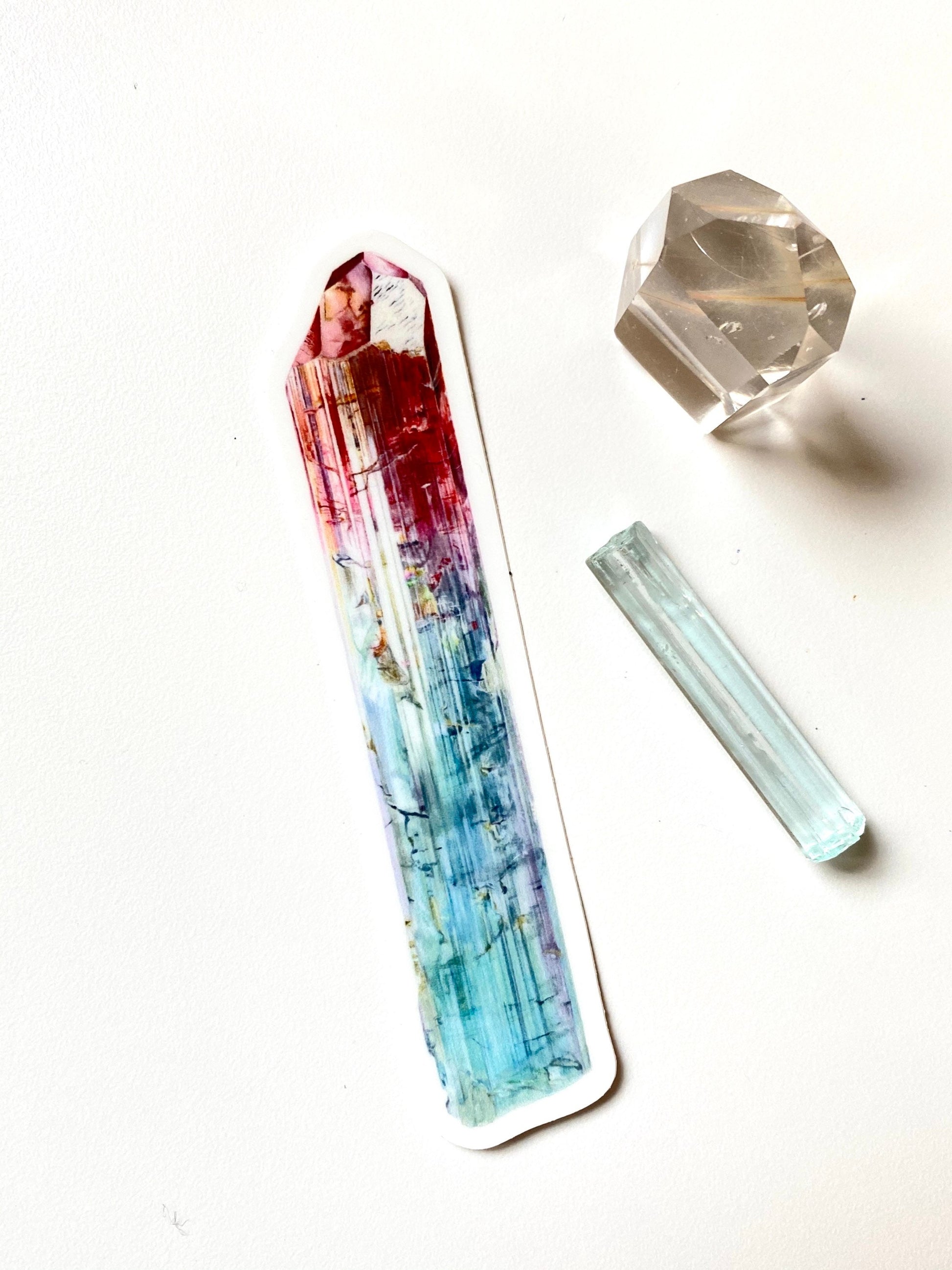 This vinyl sticker features a reproduction of my original watercolor painting of a natural tourmaline crystal from the Cruzeiro Mine in Brazil. Thick, durable vinyl protects your stickers from scratches, water & sunlight. The sticker is 1”x4” water-resistant, and printed on white with a 1/8 inch white border. They are an incredible rendition of the original artwork due to the pigment inkjet printing process.