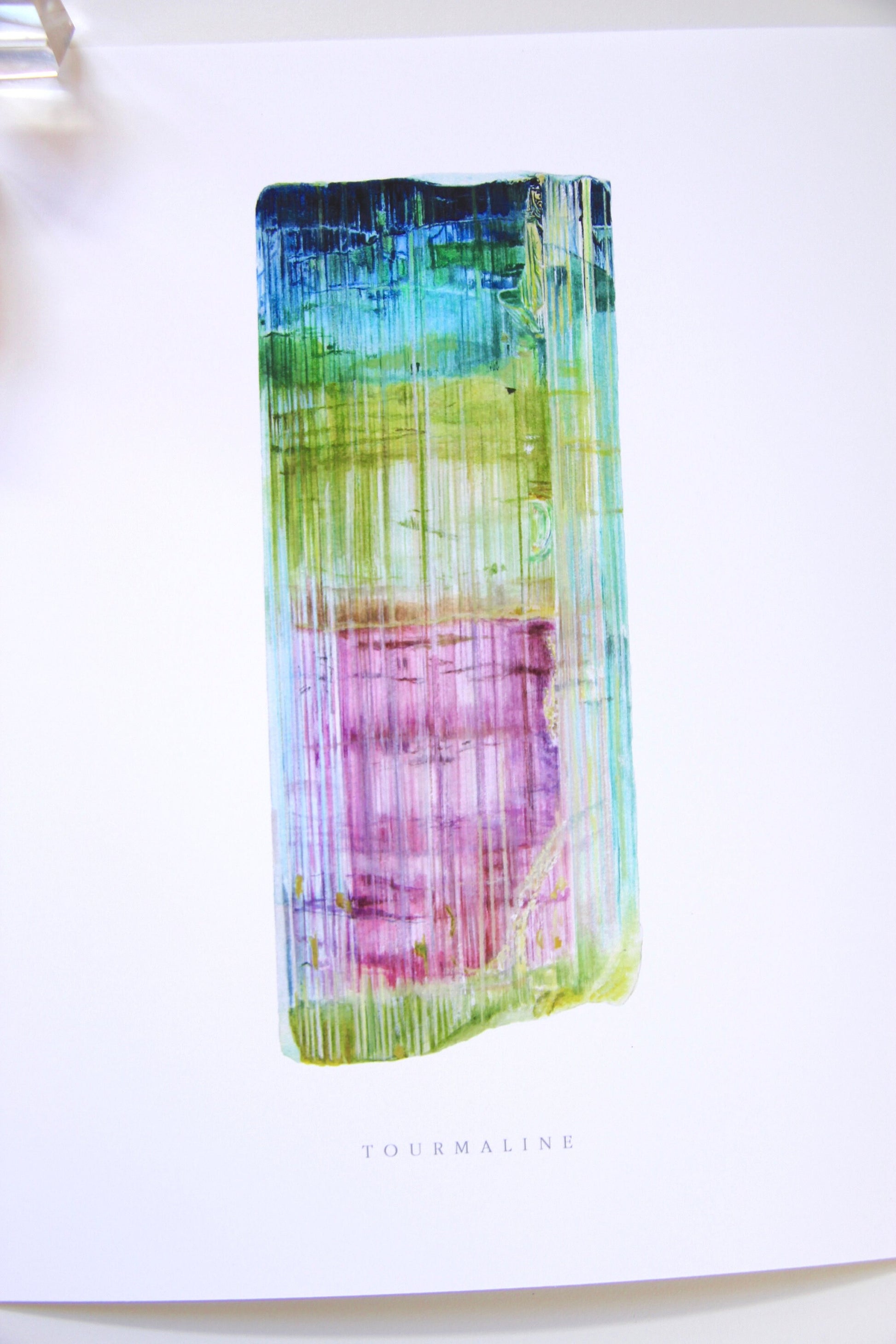This is an archival, 8"x10" giclee print of my original watercolor painting of a natural Blue-Capped Tourmaline specimen from the Sapo Mine in Minas Gerais, Brazil. Originally painted with traditional watercolor materials and techniques, this print excellently reproduces the watercolor magic with its rich tones and quality. It is printed on an archival, acid-free natural paper made of plant cellulose and cotton using premium quality pigment inks.