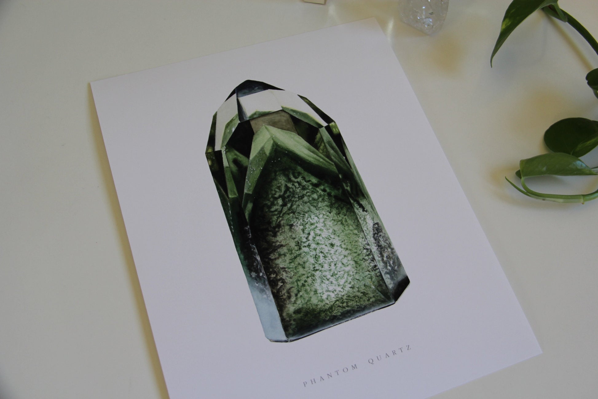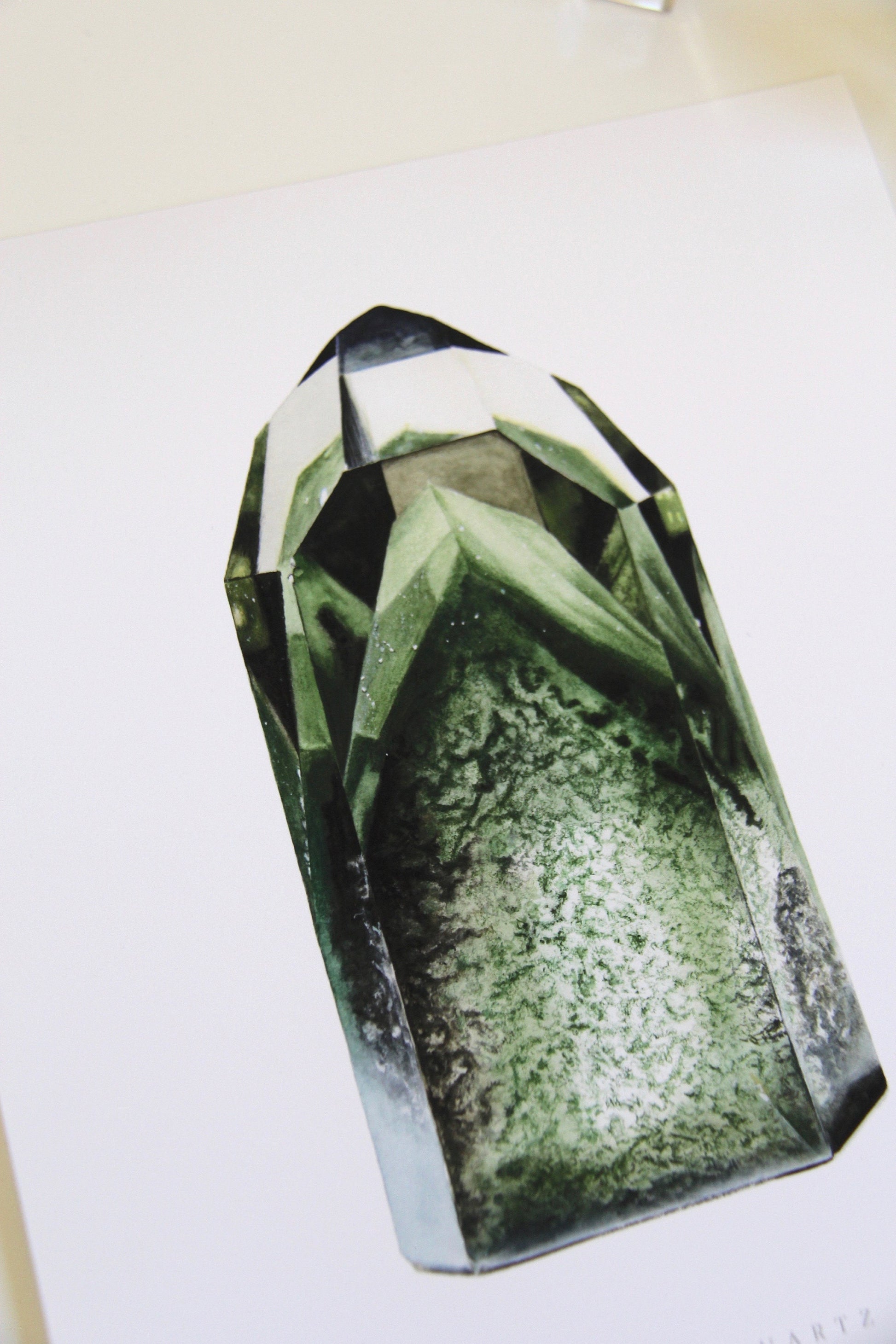 Crystal Print- Chlorite Phantom Quartz Watercolor Painting- Mineral Art, Mineral Specimen, Quartz Tower, Gemstone Art, Boho Wall Art