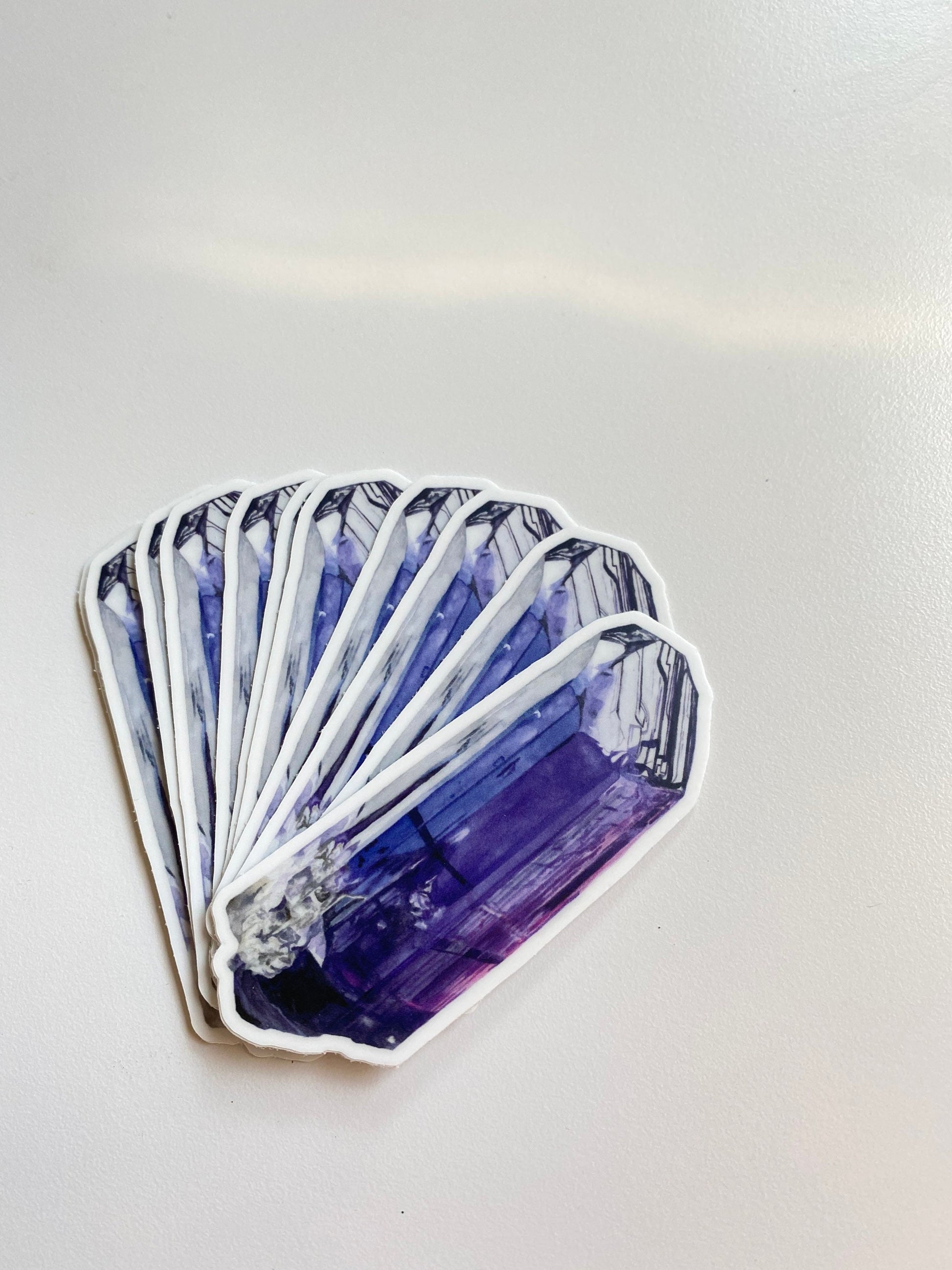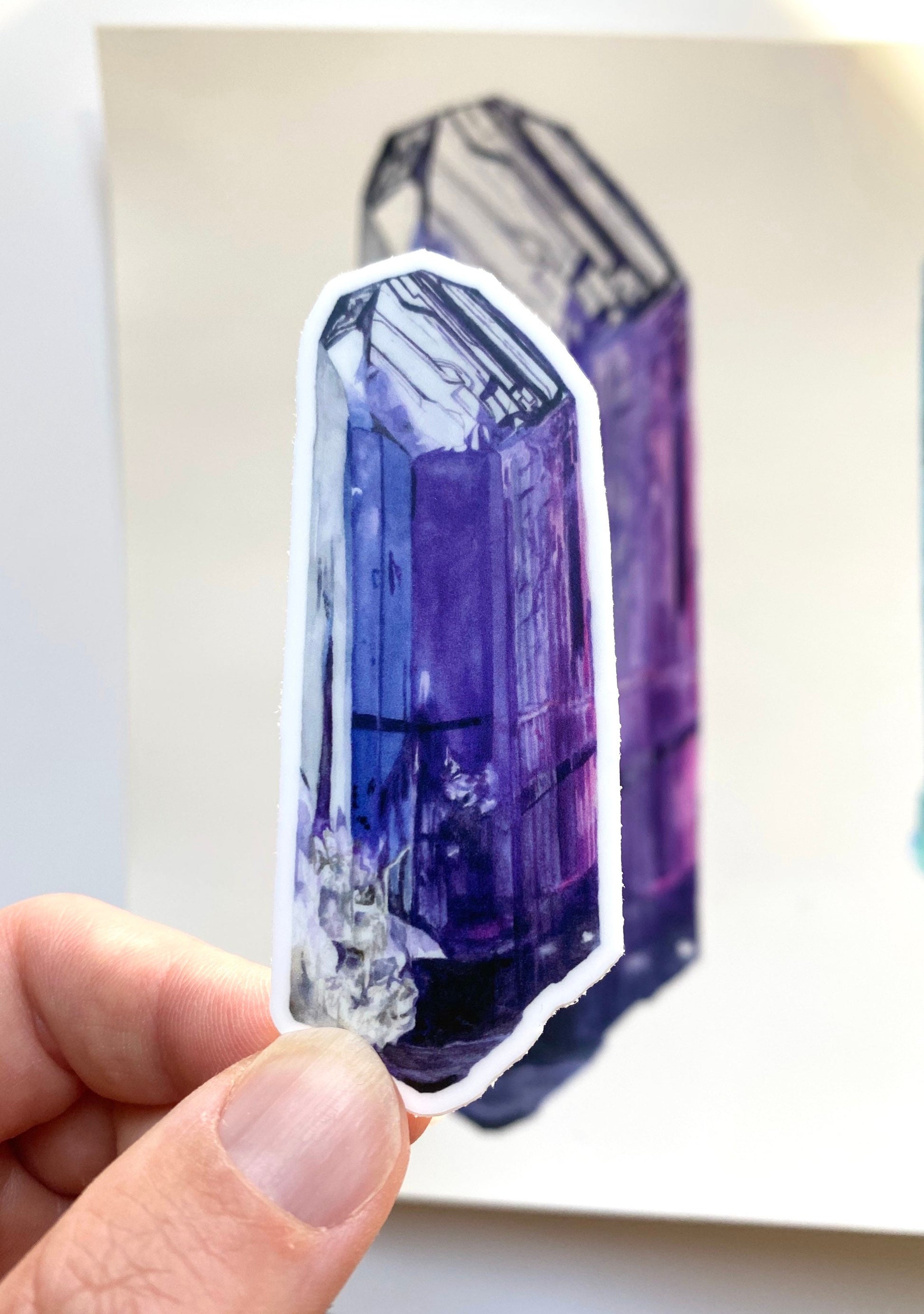 Premium custom vinyl sticker of my original Tanzanite crystal watercolor painting. Thick, durable vinyl protects your stickers from scratches, water & sunlight. 1.5”x3.5”, water-resistant, and printed on white with a 1/8 inch white border. They are an incredible rendition of the original artwork due to the pigment inkjet printing process.
