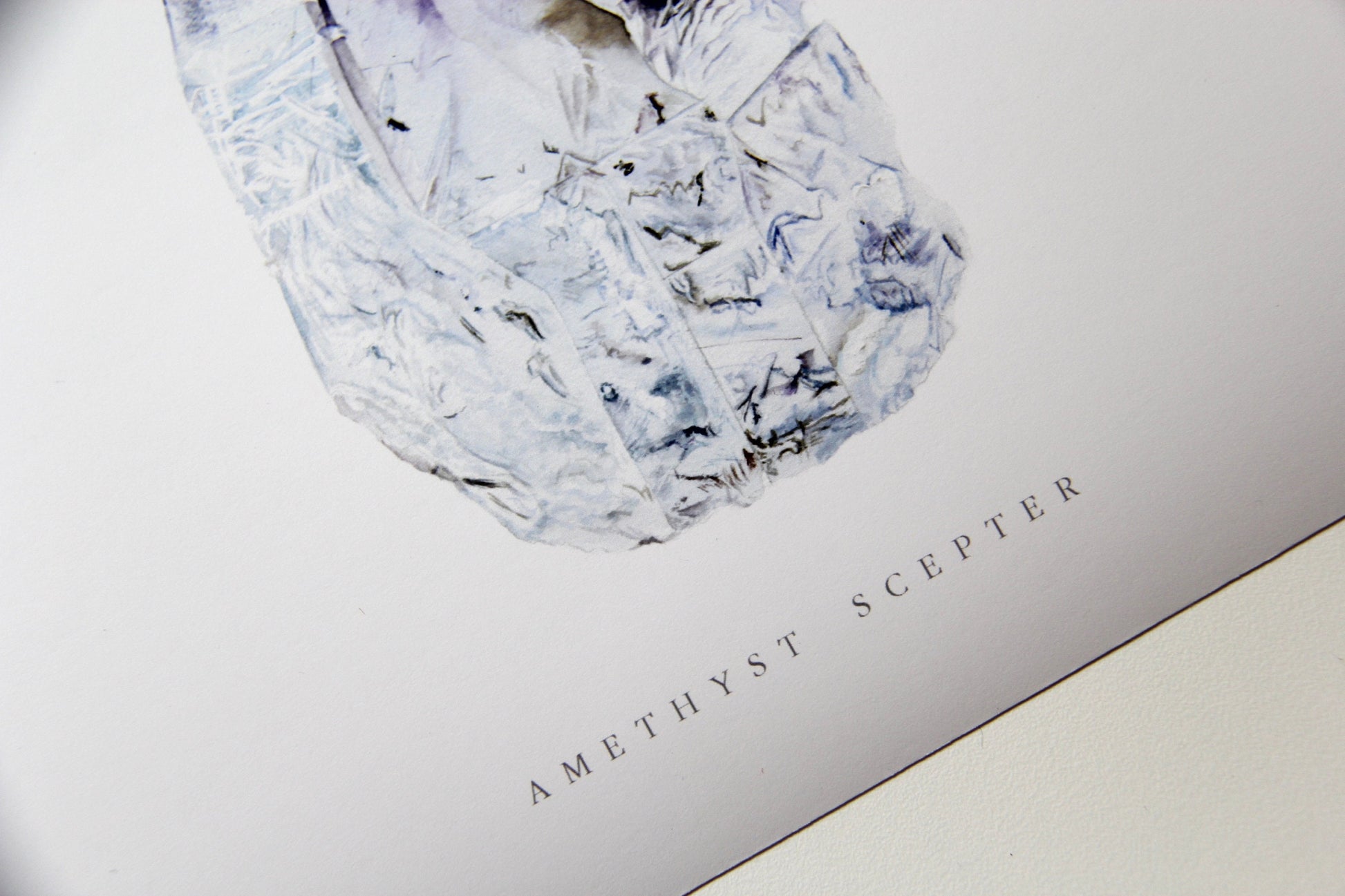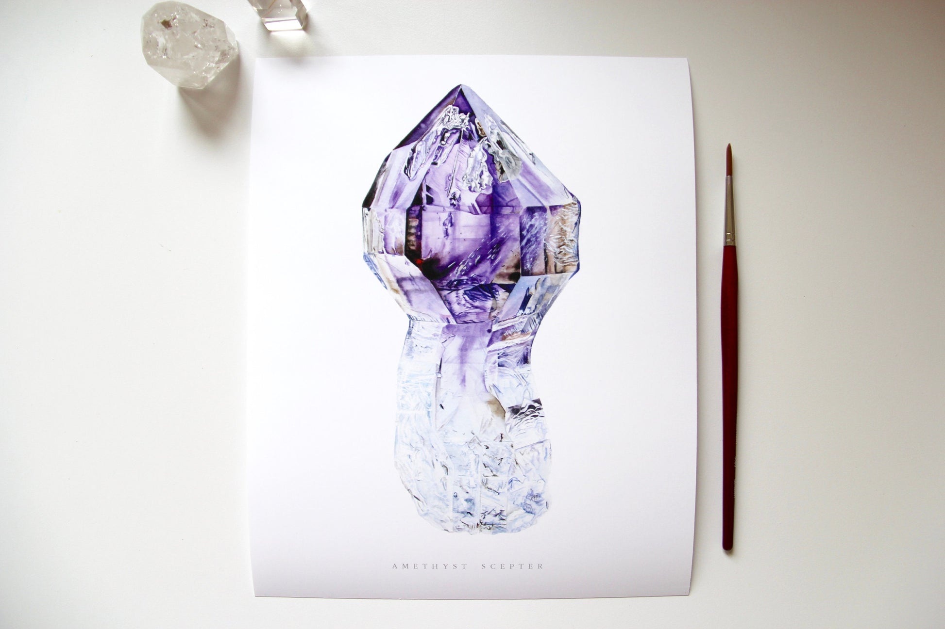 This is an archival giclee print of my original watercolor painting of a Brandberg amethyst scepter from Namibia. Originally painted with traditional watercolor materials and techniques, this print excellently reproduces the watercolor magic with its rich tones and quality. It is printed on an archival, acid-free natural paper made of plant cellulose and cotton using premium quality pigment inks. This print won't ever fade or age.