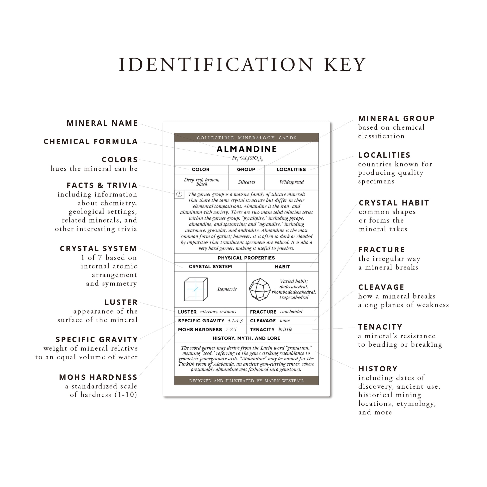 - Back: On the back, one will find rich, meticulously refined scientific and historical data relating to each mineral.