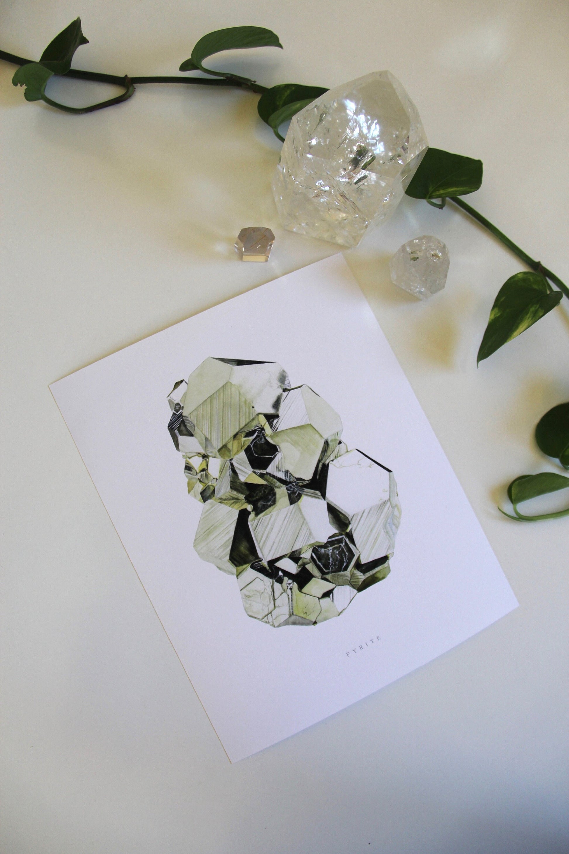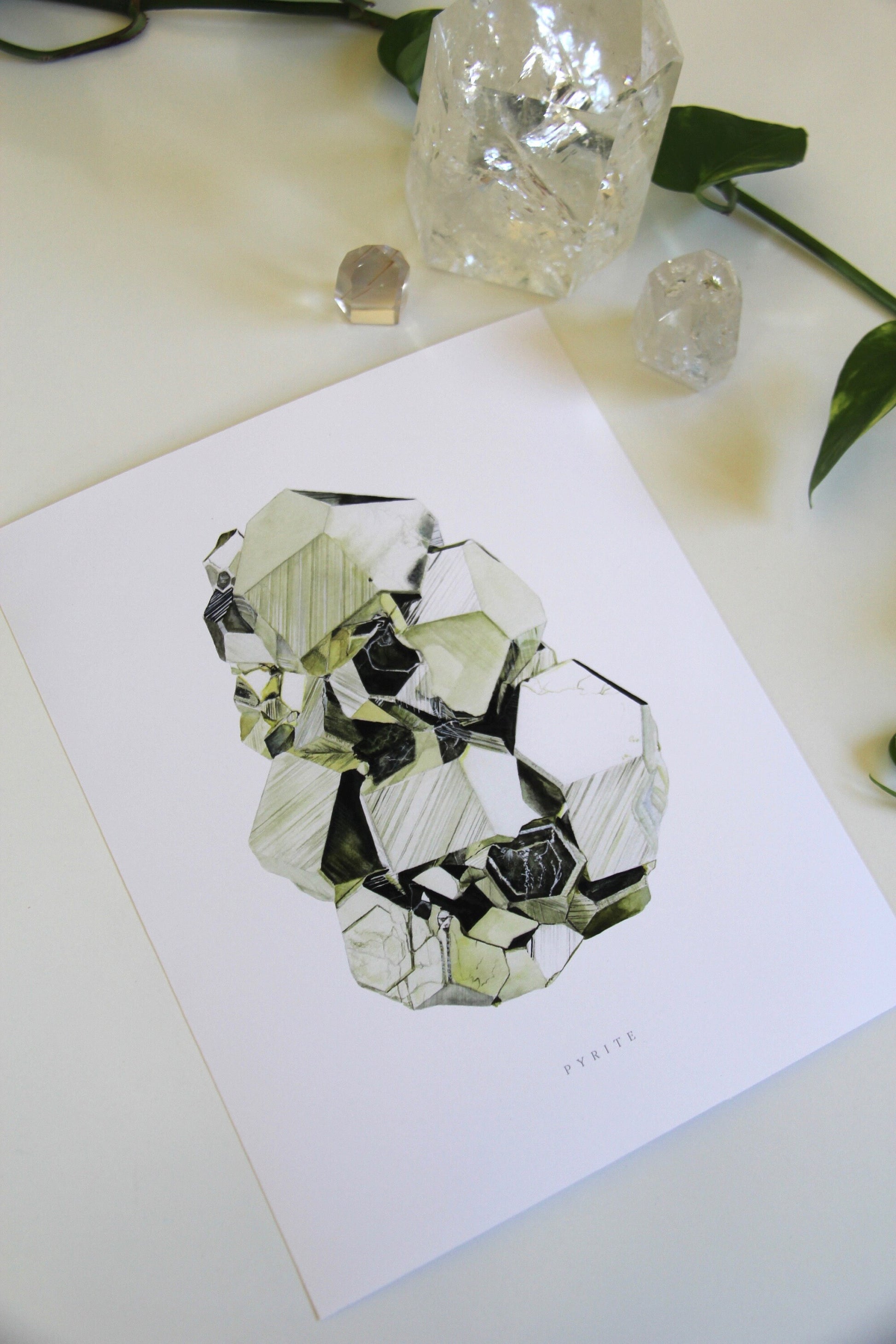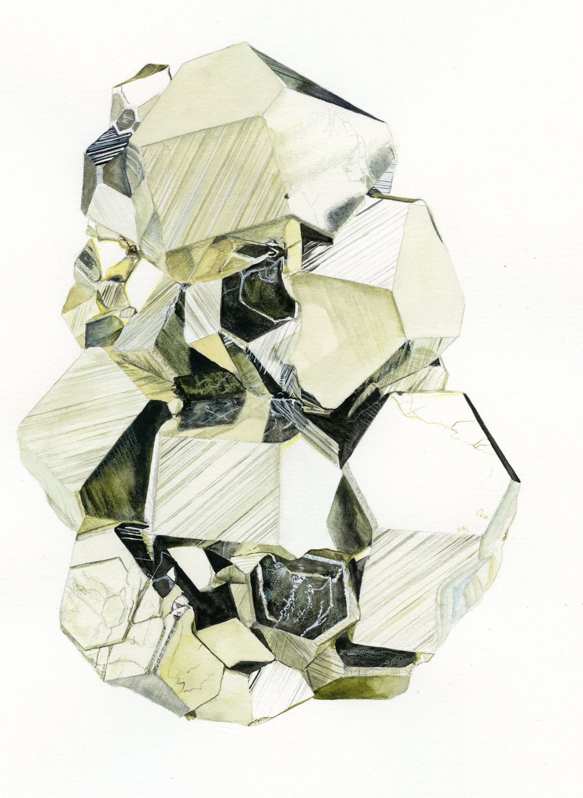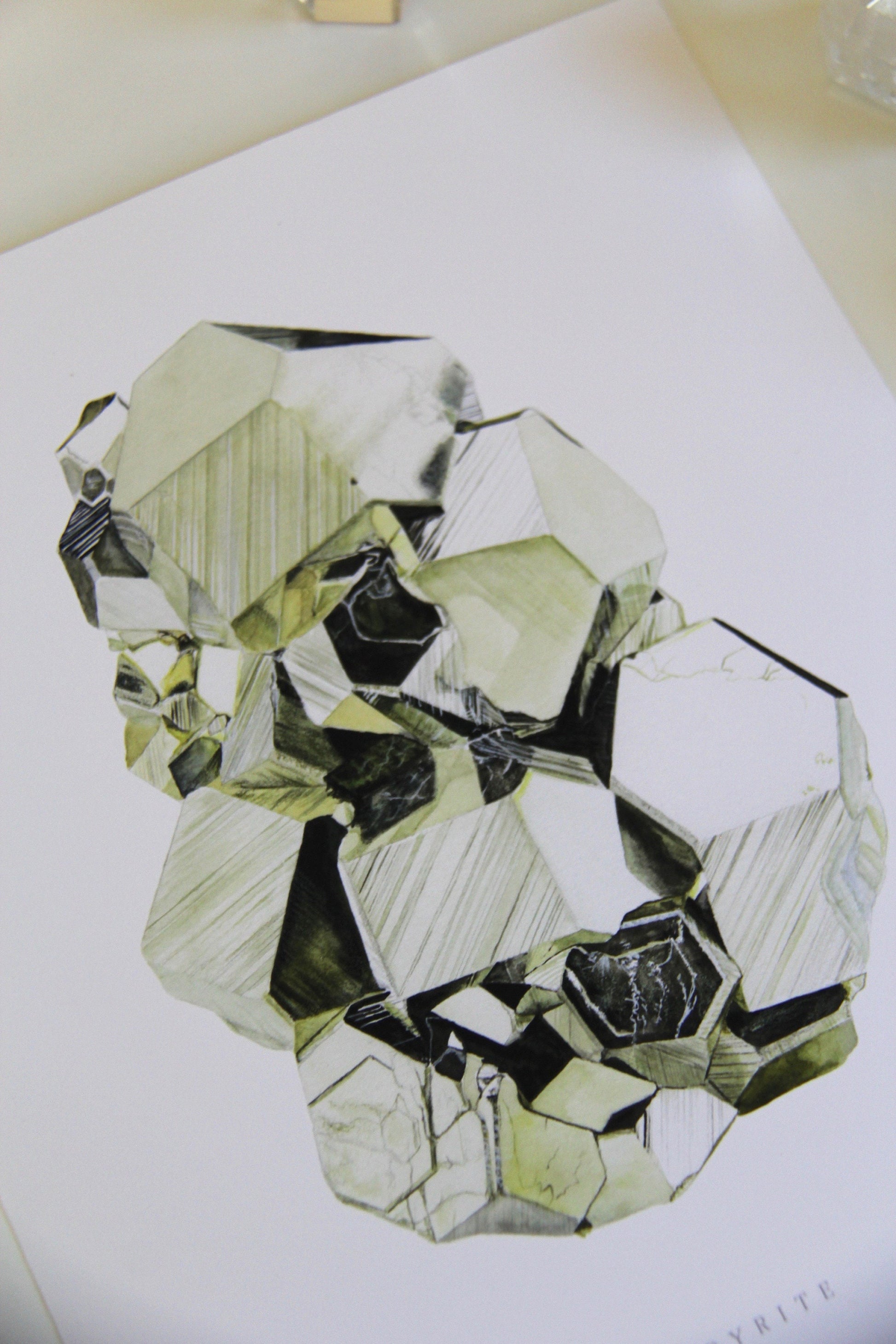 This is an archival giclee print of my original watercolor painting of a Peruvian Pyrite specimen displaying dodecahedron growth habit. Originally painted with traditional watercolor materials and techniques, this print excellently reproduces the watercolor magic with its rich tones and quality. It is printed on an archival, acid-free natural paper made of plant cellulose and cotton using premium quality pigment inks. This print won't ever fade or age.