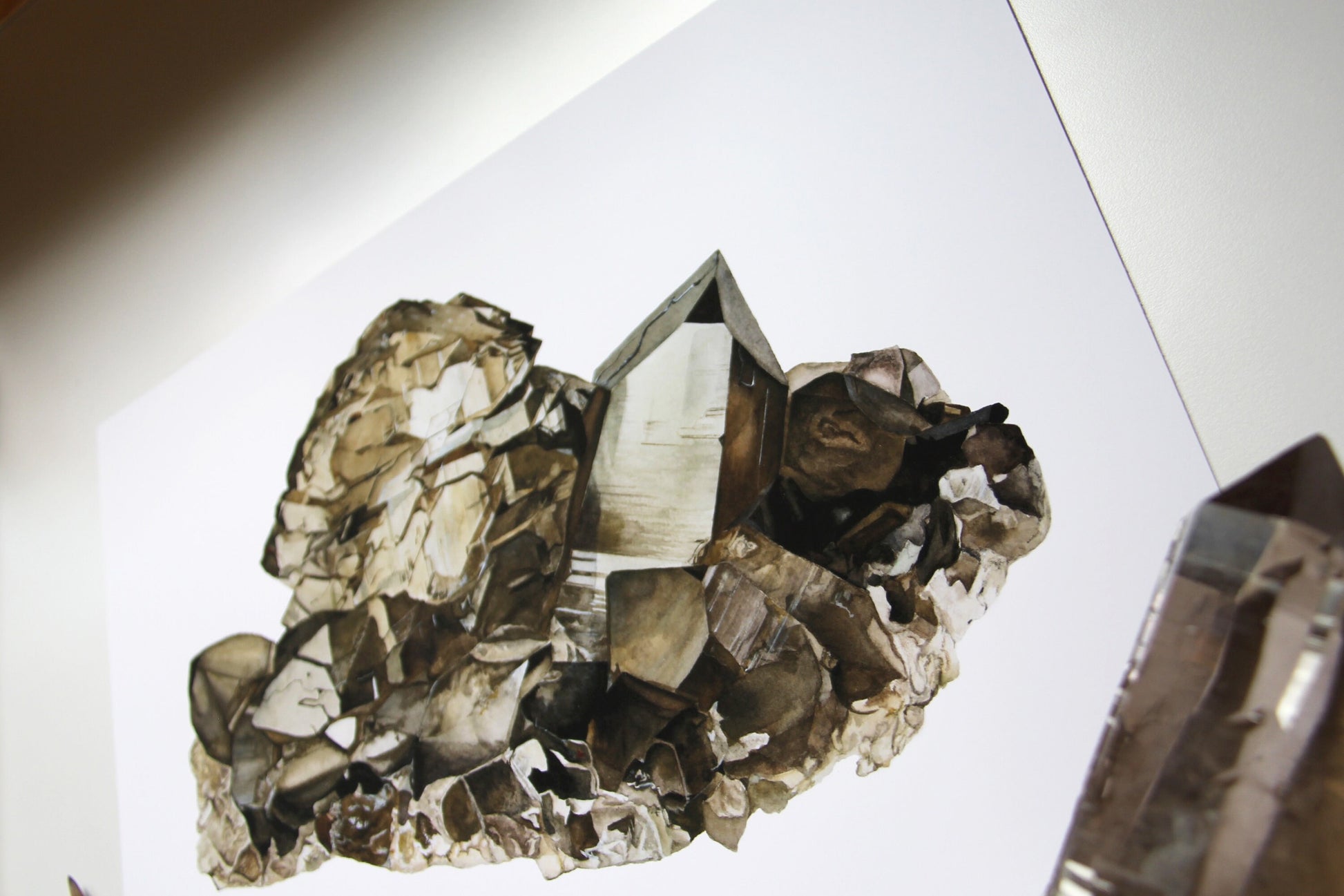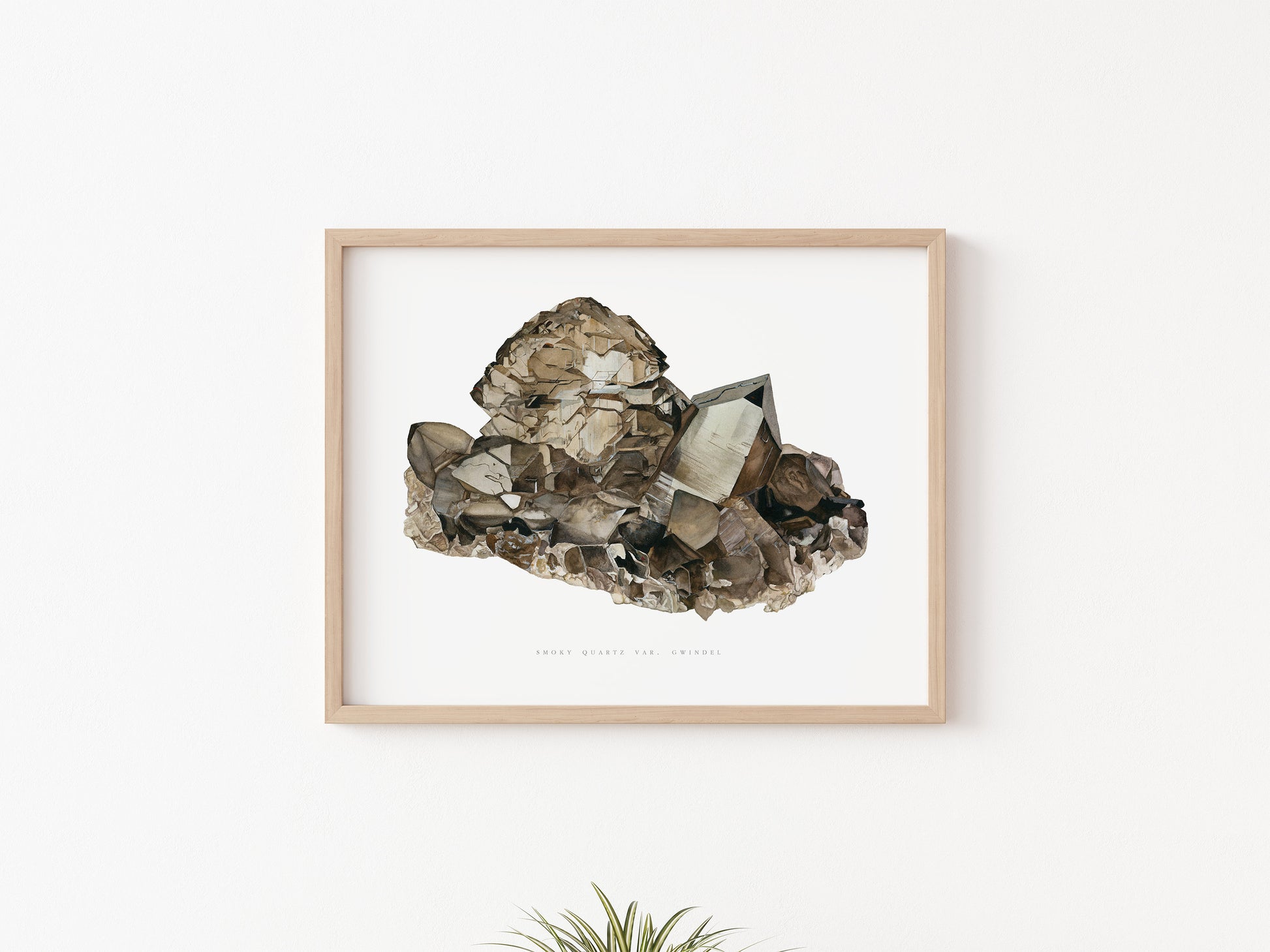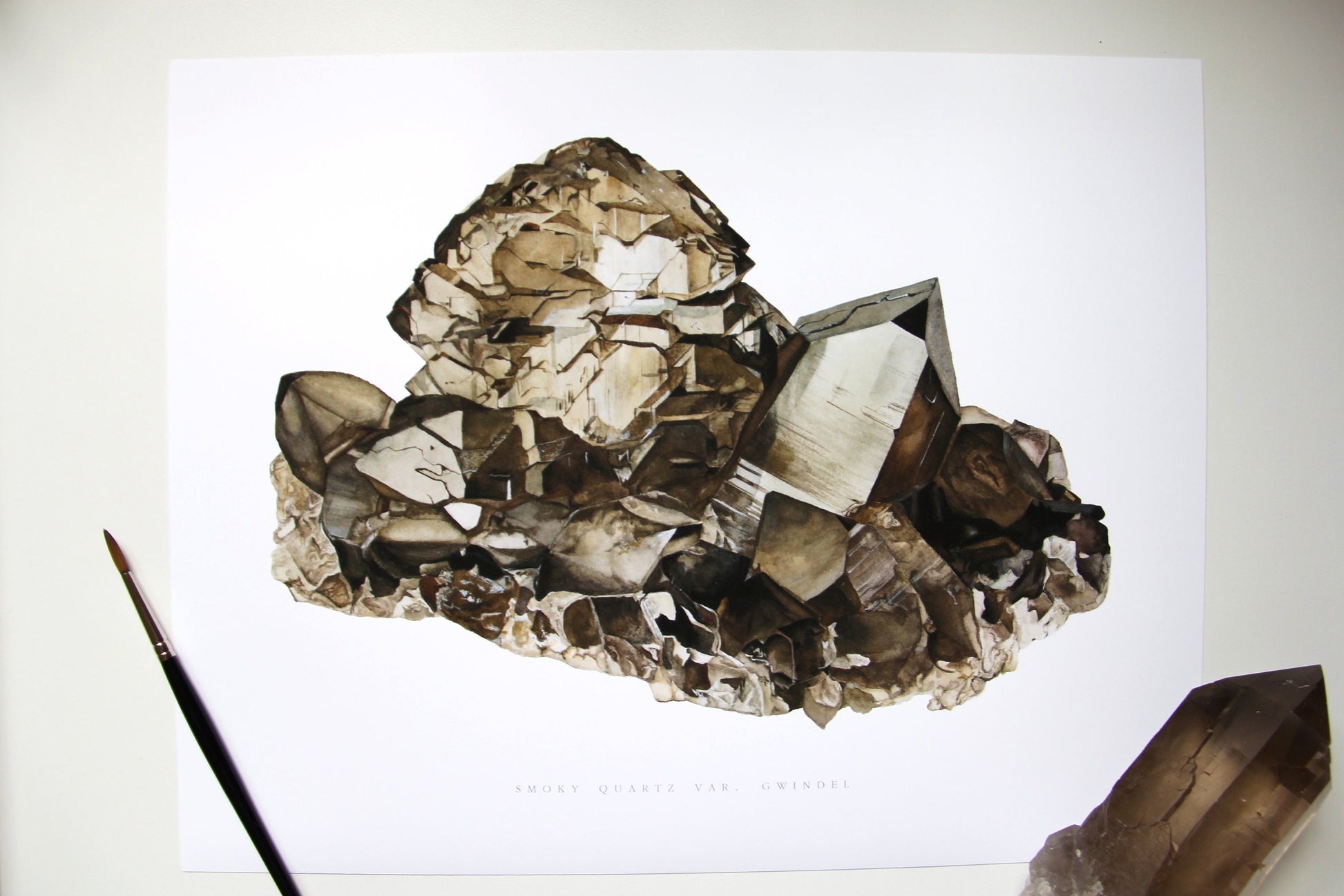 This is an 11"x14" archival giclee print of my original watercolor painting of a Smoky Quartz Gwindel cluster from Switzerland. The cluster beautifully displays a large, perfect traditional faceted point and a marvelous twisted gwindel next to it. Originally painted with traditional watercolor materials and techniques, this print excellently reproduces the watercolor magic with its rich tones and quality. It is printed on an archival, acid-free natural paper made of plant cellulose and cotton using premium quality pigment inks. This print won't ever fade or age. Also, unlike most of my other prints, this piece is oriented horizontally, but it will fit in any standard 11"x14" frame.