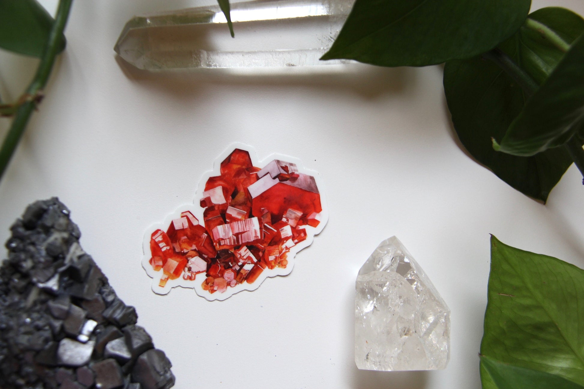 Premium vinyl sticker of my original Vanadinite watercolor painting. Thick, durable vinyl protects your stickers from scratches, water & sunlight. The sticker is 3"x3" in size, water-resistant, and printed on white with a 1/8 inch white border. They are an incredible rendition of the original artwork due to the pigment inkjet printing process.