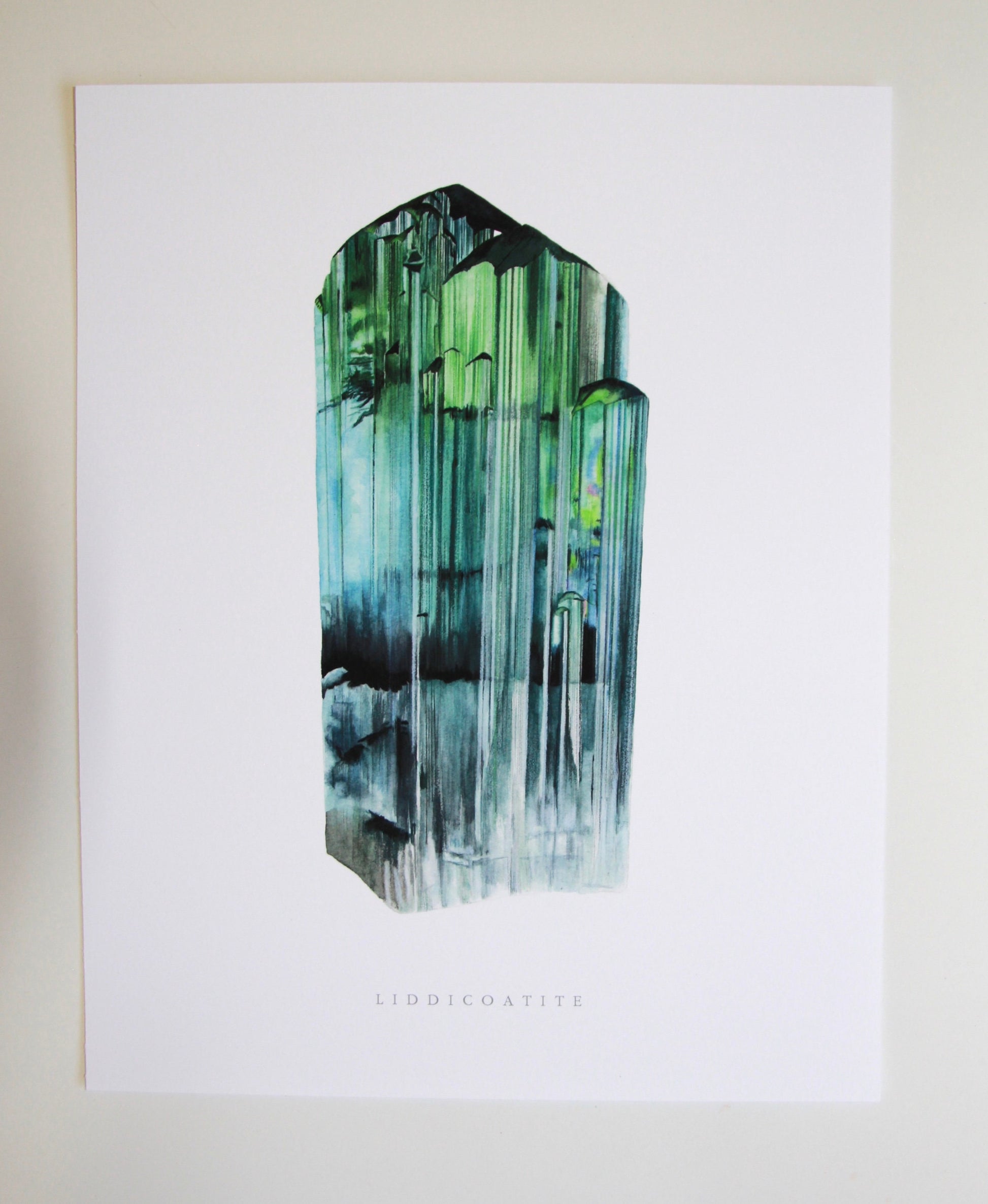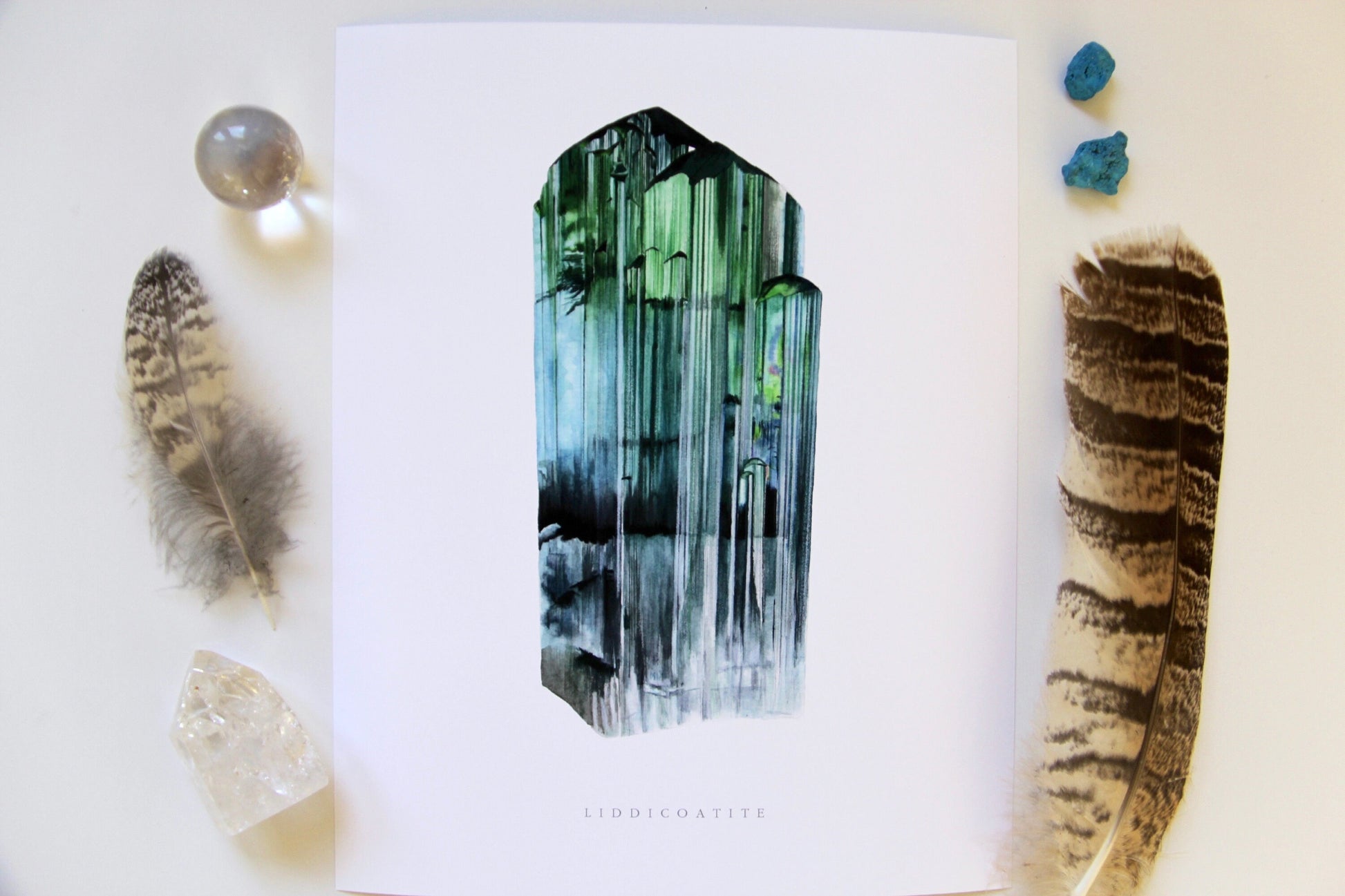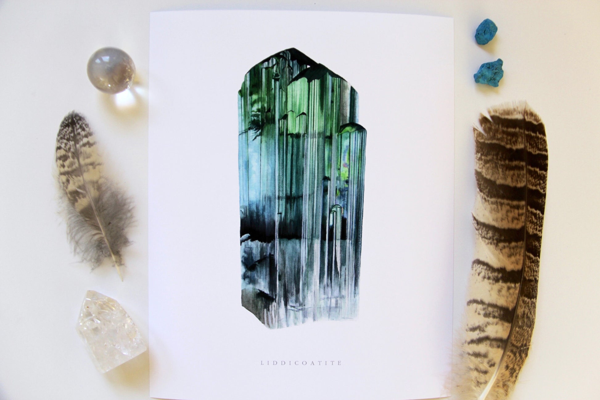 This is an archival giclee print of my original watercolor painting of a blue-green Liddicoatite Tourmaline mineral specimen. Originally painted with traditional watercolor materials and techniques, this print excellently reproduces the watercolor magic with its rich tones and quality. It is printed on an archival, acid-free natural paper made of plant cellulose and cotton using premium quality pigment inks. This print won't ever fade or age.