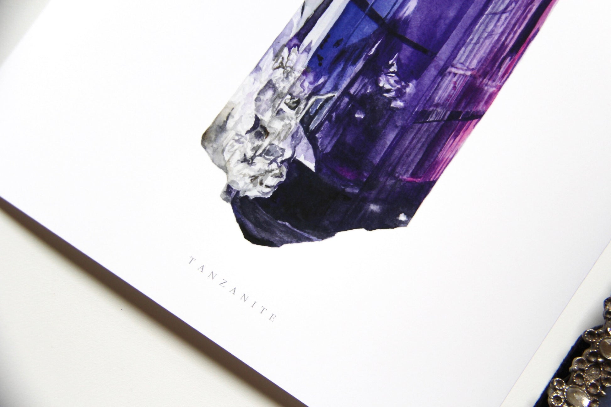 This is an archival giclee print of my original watercolor painting of Tanzanite . Originally painted with traditional watercolor materials and techniques, this print excellently reproduces the watercolor magic with its rich tones and quality. It is printed on an archival, acid-free natural paper made of plant cellulose and cotton using premium quality pigment inks. This print won’t ever fade or age.